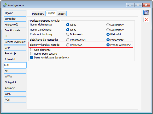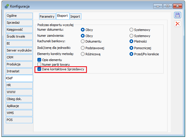 Ww. dane wysyłane są wyłącznie, jeżeli w Konfiguracji systemu włączony jest parametr Podczas eksportu wysyłaj/Dane kontaktowe Sprzedawcy.