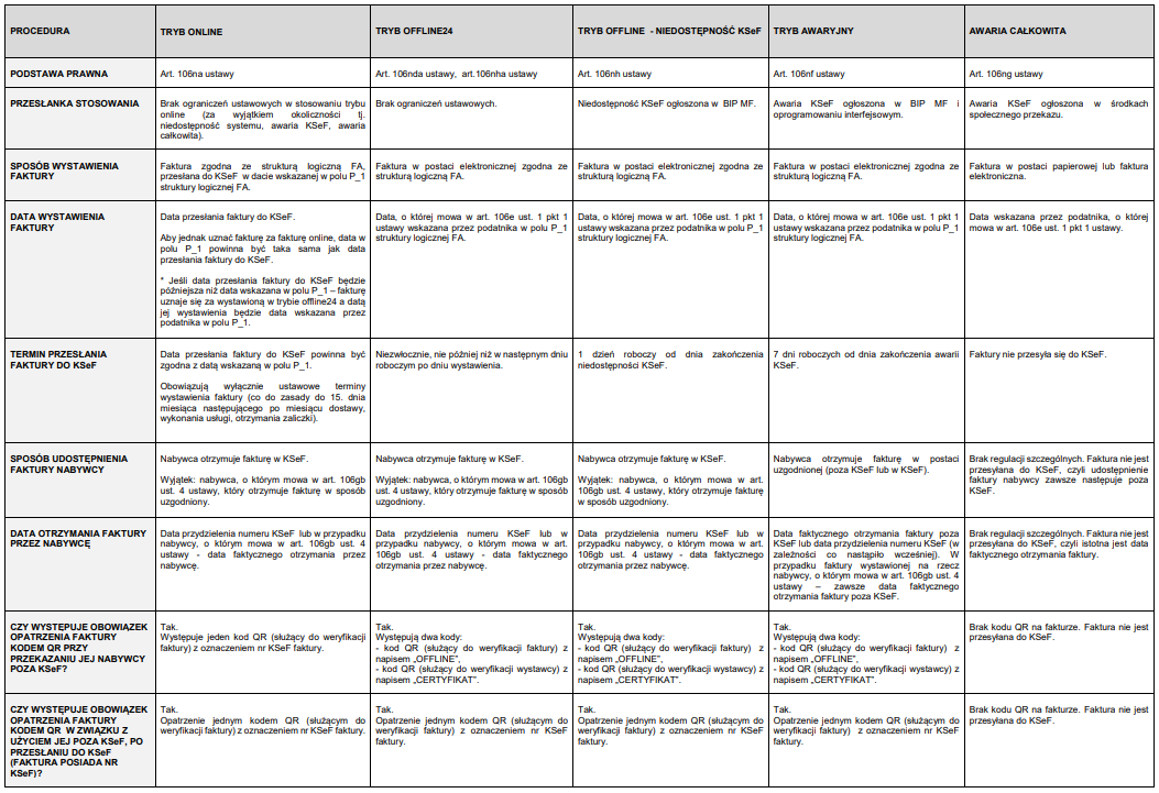 Poniższe zestawienie prezentuje kluczowe różnice w procesowaniu faktur w zależności od statusu systemu KSeF, ze szczególnym uwzględnieniem odmiennych wymogów dotyczących kodów QR oraz terminów przesyłania plików XML po ustaniu awarii. Zestawienie zostało opracowane i udostępnione na stronie Ministerstwa Finansów, w sekcji „Tryby wystawiania faktur ustrukturyzowanych – tabela”: https://ksef.podatki.gov.pl/pliki-do-pobrania-ksef-20/