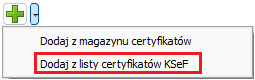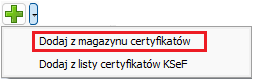 | Dodaj z listy certyfikatów KSeF | Dla operatora z prawem zarządzania certyfikatami KSeF | |